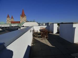 Dieter, with his piercing blue eyes, was most helpful in showing us around the place. Somehow the topic of pot came up and he laughed and smiled as he pointed out that Americans now could get high with their guns. He must have decided that we were OK as he did not think we needed to leave a security deposit with him. We were very impressed with the apartment. Despite the slightly run down appearance at the entry, the elevator (yay, an elevator) took us up to the top floor “penthouse” with a beautiful view of the Danube. See pictures below: