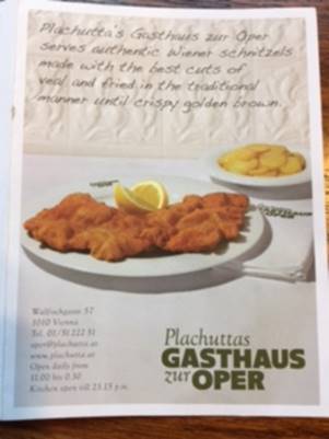 Today was quite warm (especially if you sat up top on the bus)! The bus conveniently had a stop right across the street from where we were staying so off we went with the “Big Bus Company”. We rode around to downtown near the opera house and found a high end side walk café nearby (they had cloth tablecloths after all!). Their specialty was Wienerschnitzel which is breaded and fried veal. Very good! Here is a picture of the card provided by the restaurant with cooking instructions.