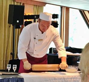 The Captain’s welcome dinner was tonight and “boy howdy” was it an affair. There must have been 6 or 7 courses of food! After dinner we had an interesting talk from a young man who was a Syrian immigrant. He fled Syria because of Isis and the risk he would be captured and forced to fight. He noted that Syria is rich but most of this is kept from the ordinary people. It sounded like quite a harrowing journey traveling from Syria through Turkey and eventually to Austria. He now must master German in order to work or go to school in Austria.