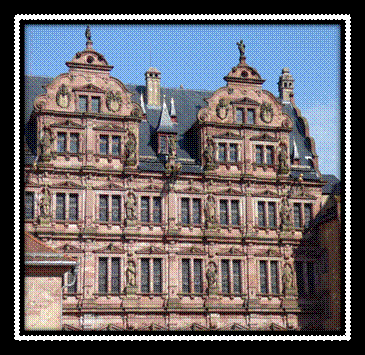 We first explored Heidelberg castle up on the hill above the town. We were herded about through throngs of other tourist groups. This is a 15th century Gothic castle with a great view of the city and the surrounding Odenwald forest. It is made of red sandstone and was partially destroyed by lightning strikes twice in its history. Here are a few pictures of the castle and views over the city: