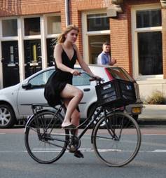 Then we found a bench and sat and ate ice cream and watched people and bikes. The Holland people are mostly blond and you hardly ever see anyone that is fat. Do you suppose there is a connection between the bikes for transportation and remaining slim? The bikes often have “cargo” boxes in front filled with groceries, children or whatever. There are bike lanes on all roads except for the small side roads and watch out because bike riders have the right of way. There are also mopeds speeding along these lanes. Pedestrians don’t stand a chance – you have to always be watching for traffic and bikes. Apparently bike stealing is a common practice so many will have “junkers” for everyday commutes and more expensive bikes for recreation. Final comment on bicycle riders – no one ever had bike helmets on. Here are a variety of pictures of the Amsterdam bike riders: